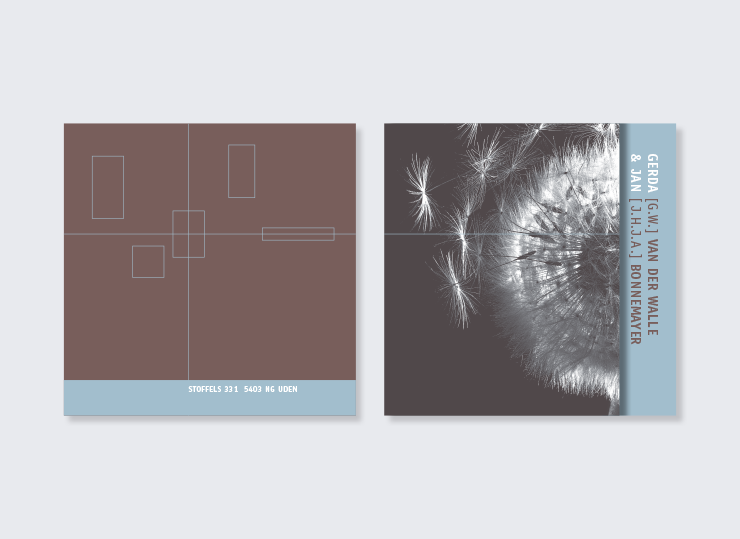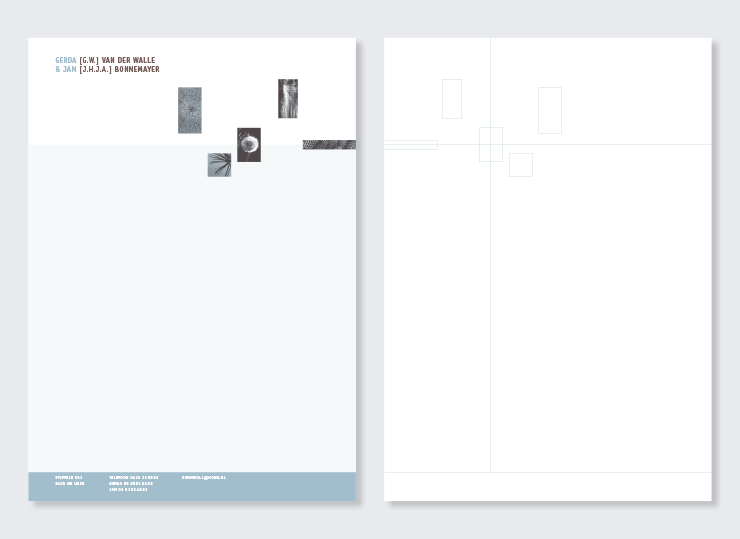 Naast de huisstijl voor het architectenbureau kreeg ik ook de vraag om een persoonlijke huisstijl te ontwerpen. Het echtpaar Jan Bonnemayer en Gerda van der Walle houdt ervan om handgeschreven brieven te verzenden. Zij bewonen een huis van de architect Jan de Jong, in de stijl van de Bossche School. De huisstijl is daarom ontworpen met het plastisch getal als grondslag, alle vlakken zijn in de door deze leer voorgeschreven verhoudingen. Op de achterzijde van het briefpapier worden de vlakken/verhoudingen nog eens in lijn getoond. Ook de kleuren - binnen de Bossche School hanteert men een kleurpalet van ‘vergrijsde kleuren’- zijn zo bepaald. Het huis is omringd door natuur, vandaar de keuze voor de beelden. Er zijn drie verschillende briefpapieren gemaakt, één voor haar, één voor hem, en één voor hen beide.